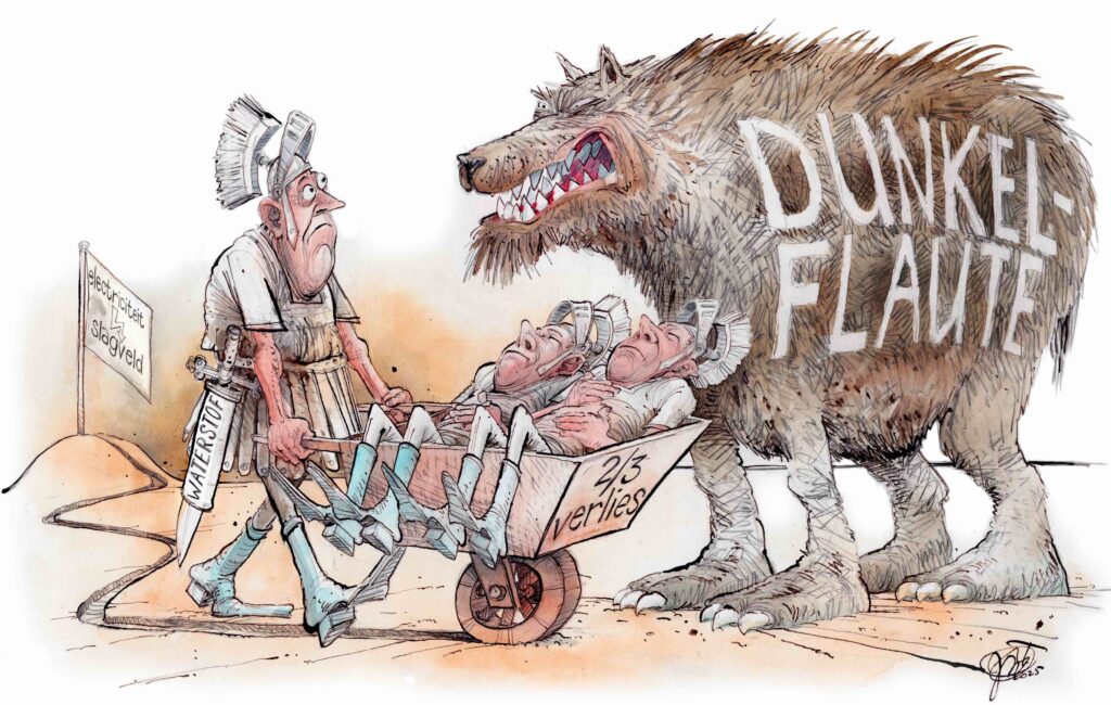 Een elektriciteitsbehoefte in 2030 van 138 TWH per jaar betekent dat gemiddeld per uur 15,75 GWh nodig is. Bij een Dunkelflaute moet dan, afgerond, (16 min 3) dus 13 GWh als backup gevonden worden. Wellicht is enige import uit omringende landen mogelijk maar veel zal dat niet zijn omdat die met hetzelfde probleem geconfronteerd worden. Elektriciteit uit waterstof lijkt dan de enige ‘groene’ oplossing.