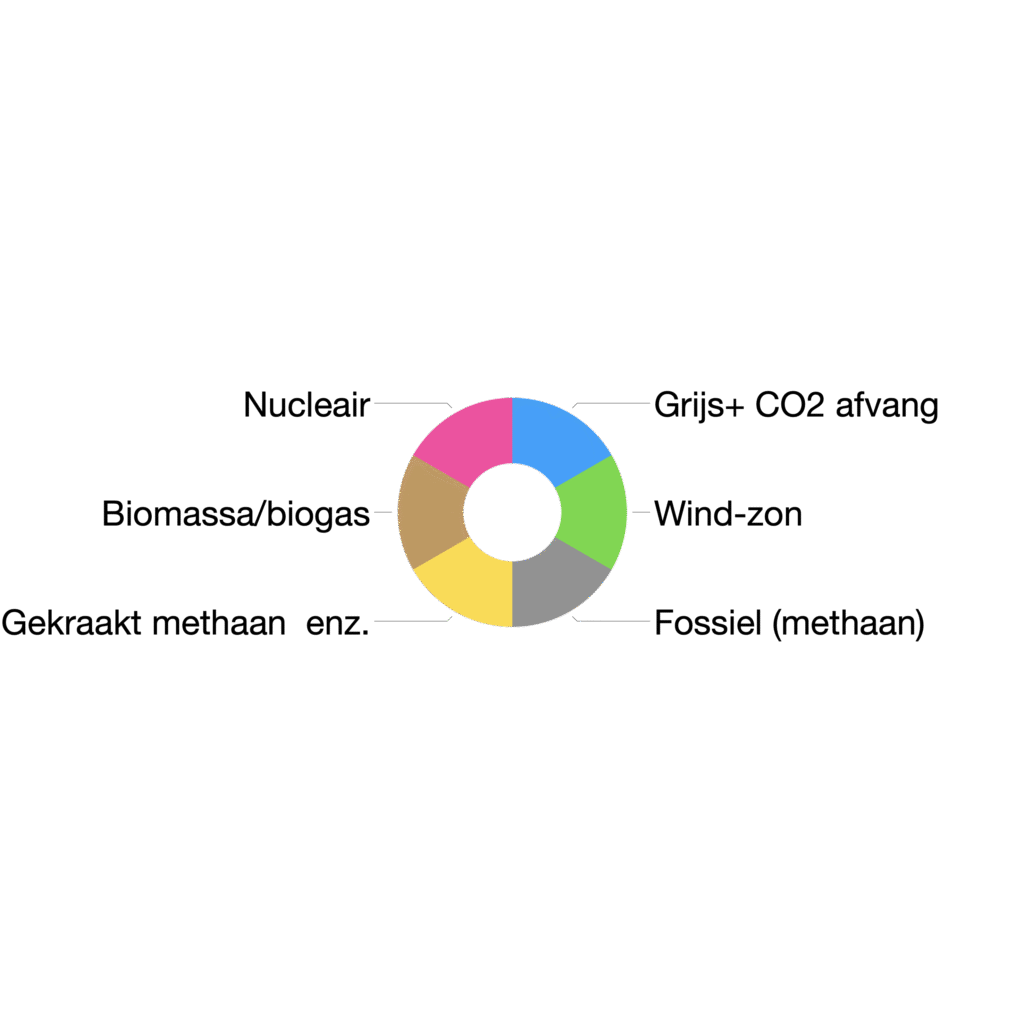 ‘Groene’ waterstof kan worden geproduceerd door ‘groene’ elektrische stroom door water te leiden in een electrolyser. Daarbij wordt het water gesplitst in waterstof en zuurstof. Er zijn twee typen electrolysers, de Alkaline en de PEM, die in aanmerking komen om groene waterstof te produceren (2) Tot nu toe is deze techniek alleen kleinschalig toegepast, omdat waterstof tegen een veel lagere prijs, ca. € 2,5/kg (3) uit methaan kan worden gemaakt. De grootste electrolyser, in Europa, een PEM-electrolyser, staat in Spanje en heeft een capaciteit van 20 MW. Dit type electrolyser is het meest geschikt om te werken bij een wisselend energie-aanbod zoals bij windenergie (2).